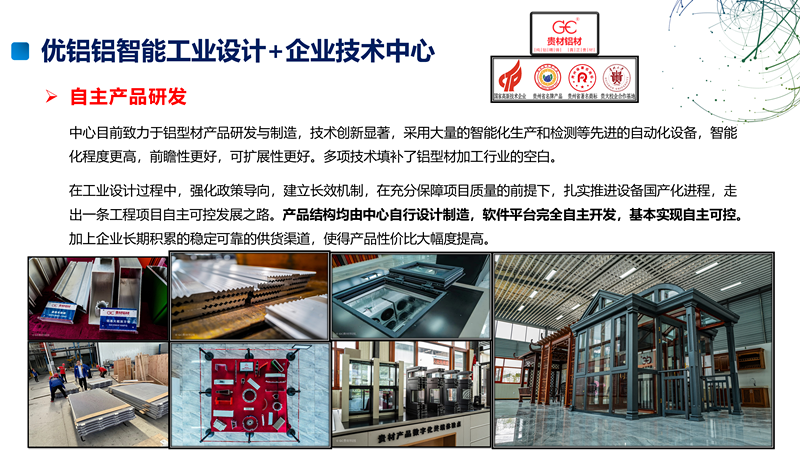 根据公司发展战略,为推进科技进步,增强企业核心竞争力,加快公司发展,经公司研究决定,于2019年01月08日成立优铝智能制品工业设计中心,然后2021年通过贵州省级工业设计中心认证。工业设计中心实行总经理领导下的中心主任负责制,中心主任在其职责范围内具有人、财、物支配权。成员由设计、技术、市场、信息、生产、管理等专业人员构成。中心负责企业研究开发方向、技术创新规划、年度开发计划、重点课题和经费预算等重大问题的决策,并对工业设计中心的工作绩效进行评估。