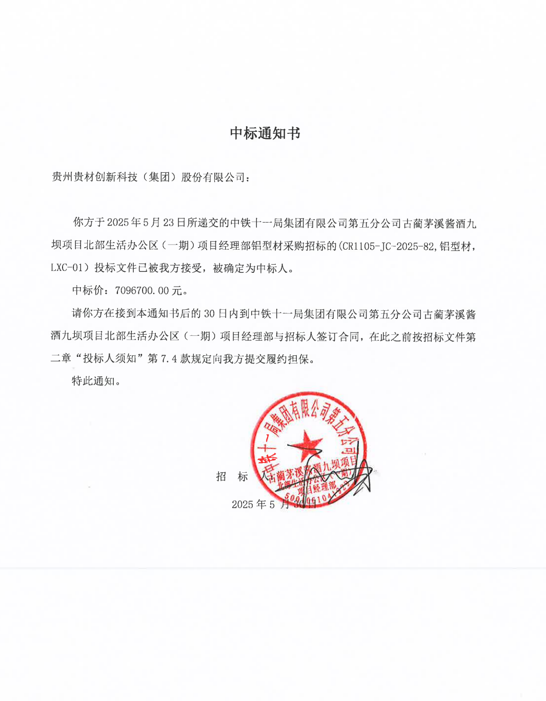 贵材科技(集团)中标中铁十一局古蔺茅溪酱酒项目